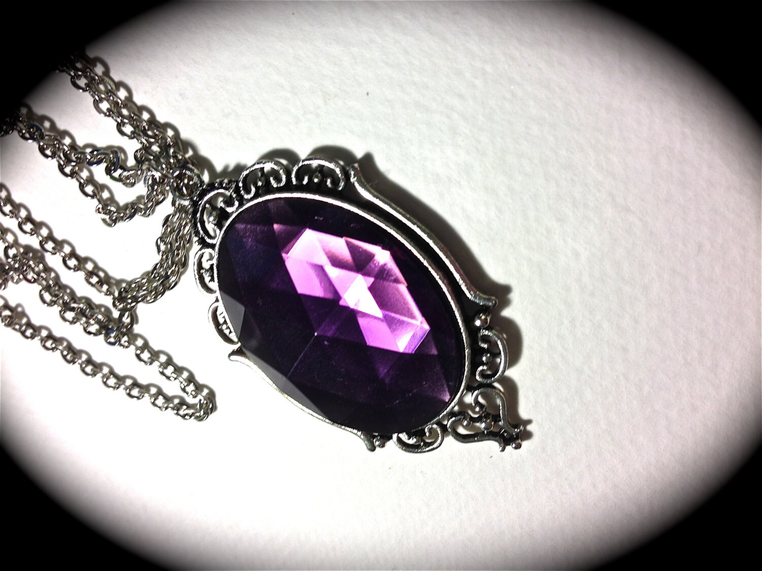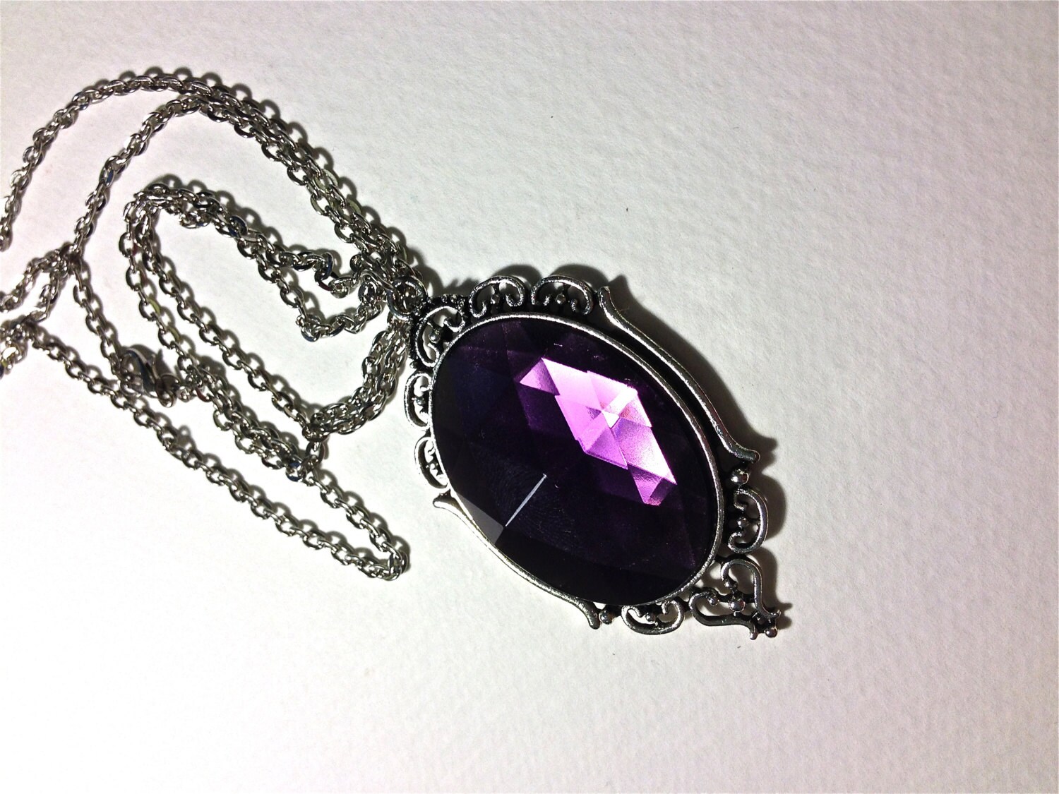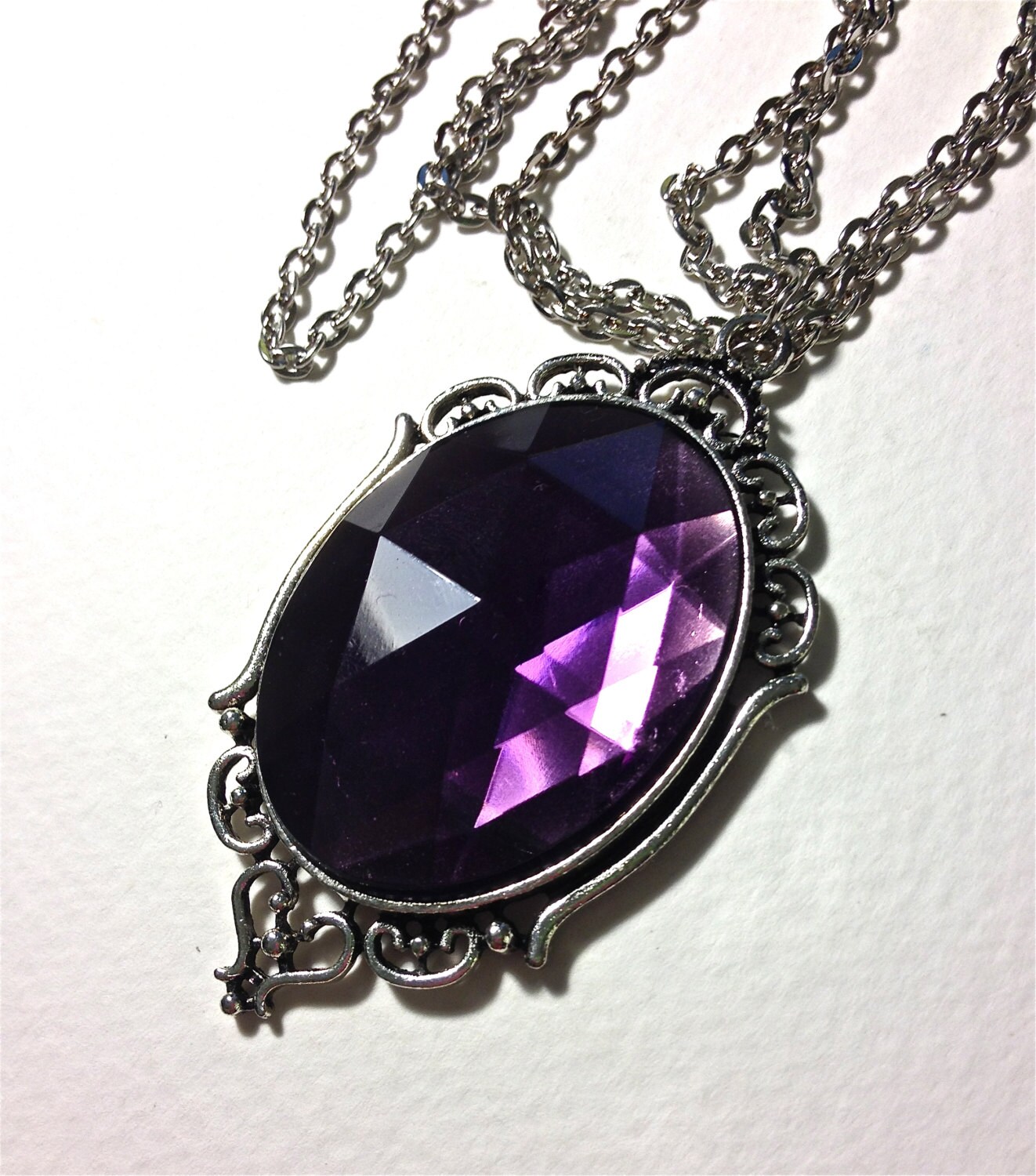 A Pure Sin original handmade item made by myself; this item is just for you! A gorgeous 30x40mm purple amethyst faceted cabochon is nested in an antique silver cameo base. The setting is silver toned and has such beautiful original detail. Amethyst is a man-made acrylic gem that is known for its beautiful vibrant purple color. It looks amazingly elegant and riveting.