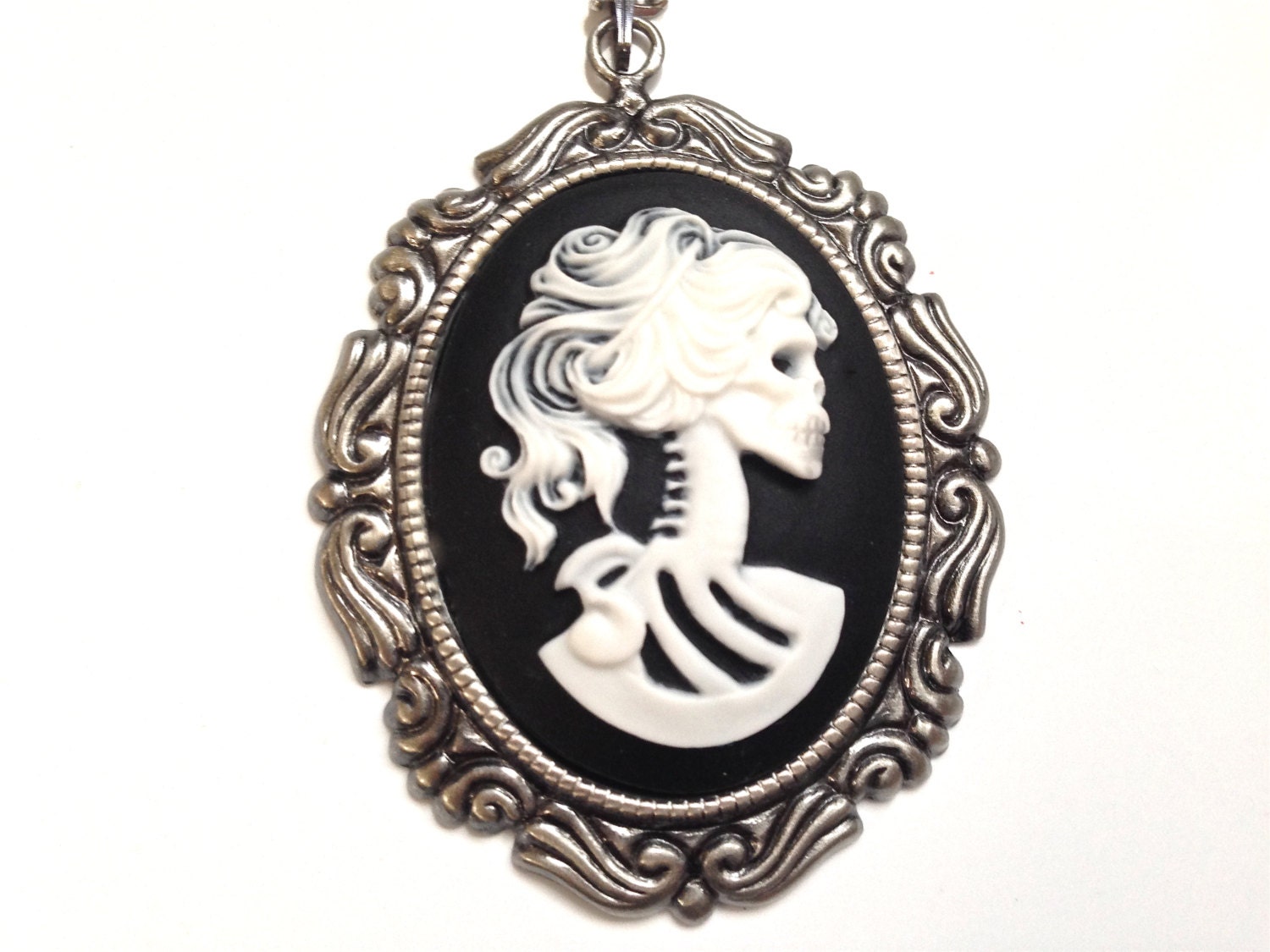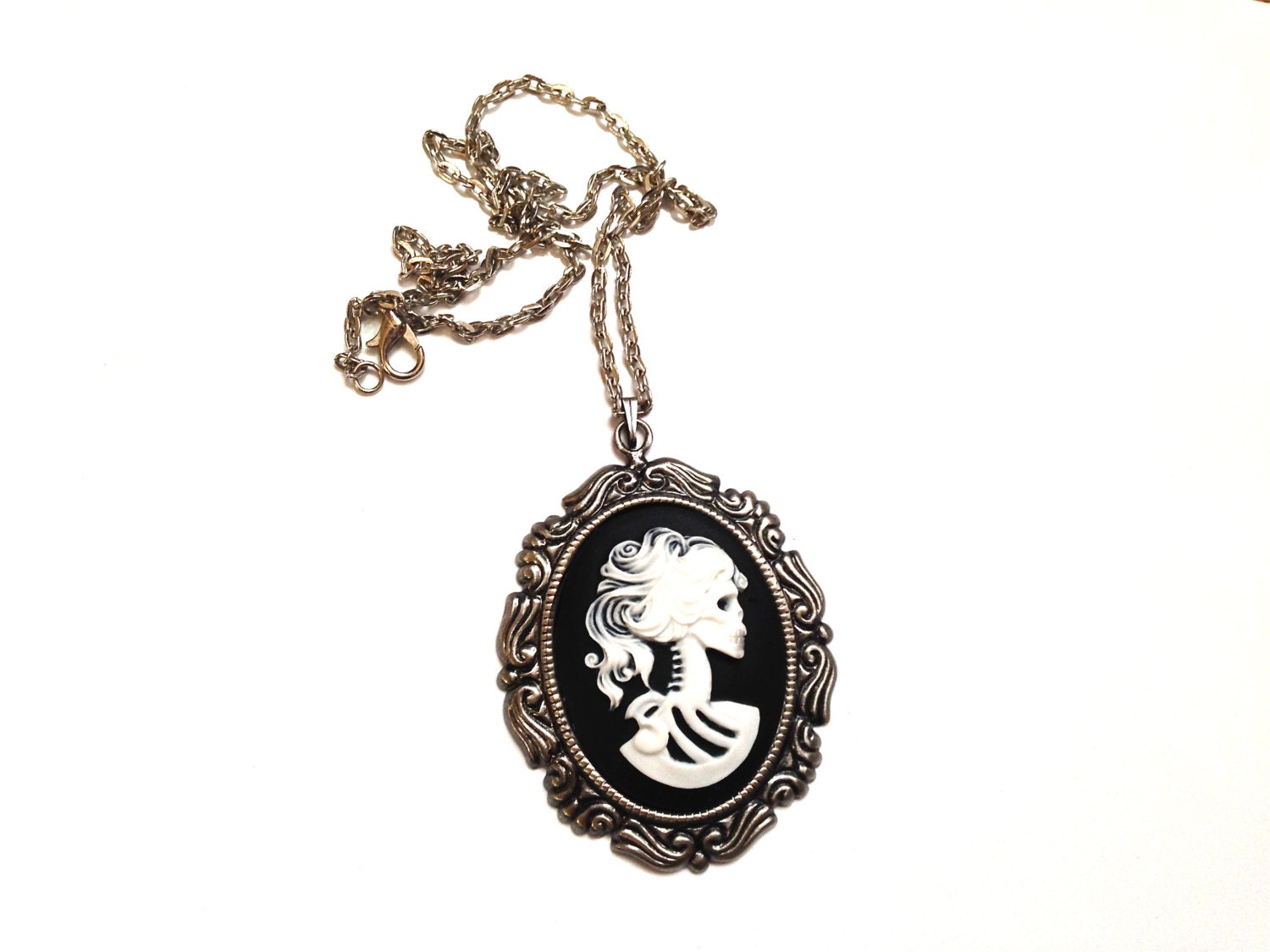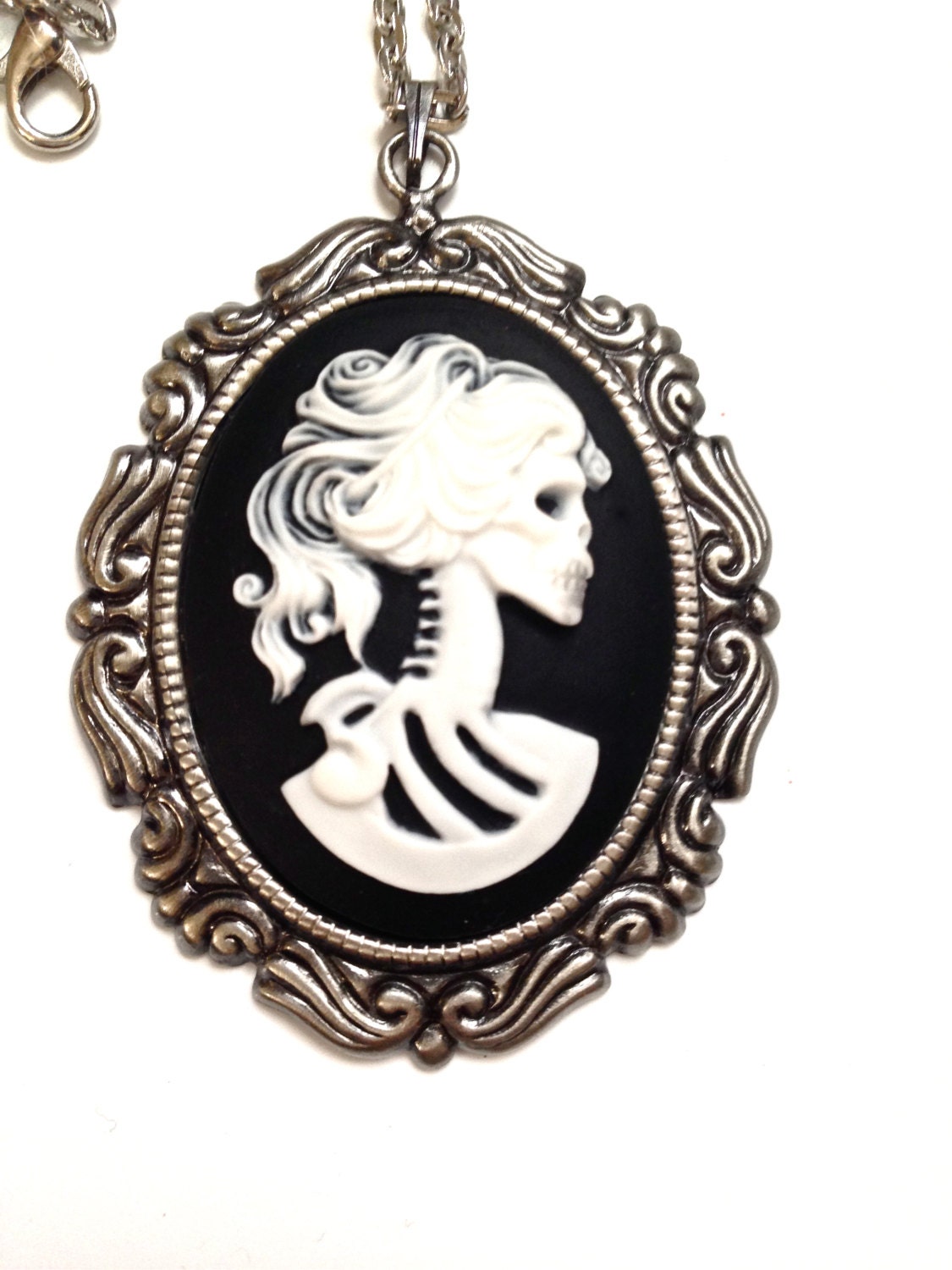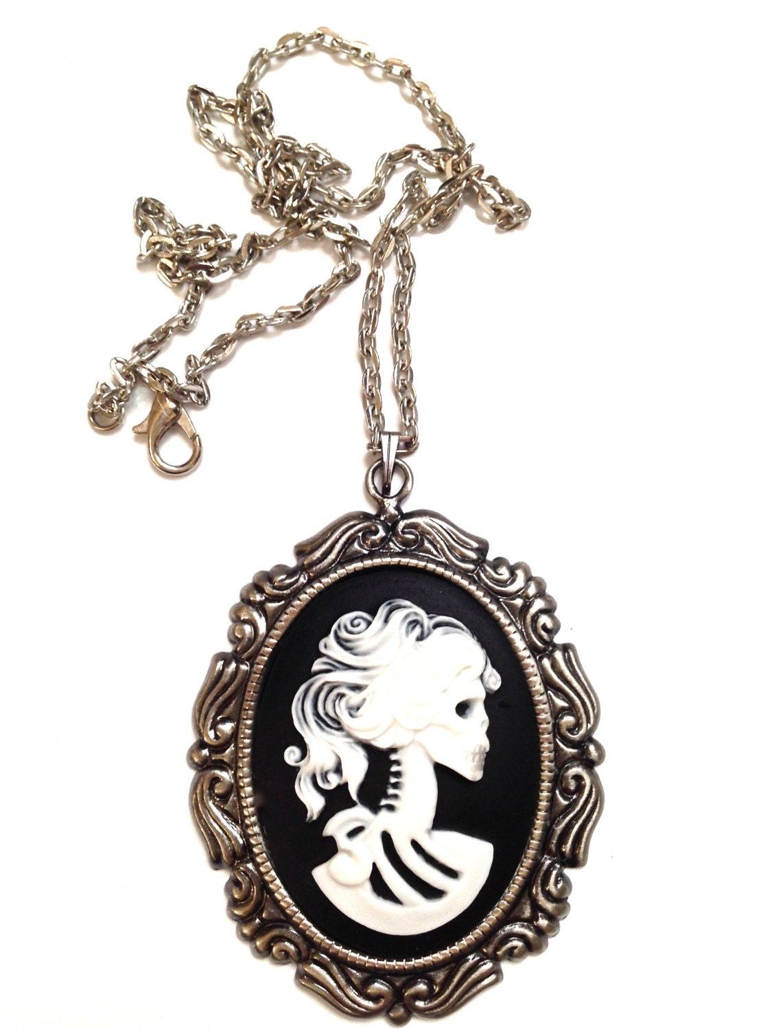 A Pure Sin original handmade item made by myself; this item is just for you! This classic lady Lolita skeleton cameo necklace is just divine. This lovely piece of jewelry measures to fit a 30×40 mm cameo and comes with a great antique toned silver necklace that measures about 16 inches in length. The Cameo itself is white on black and rests in a gorgeous antique silver setting that has so much beautiful character. The size of this necklace is large and is the largest size cameo I carry. It is larger than a silver dollar. Excellent quality and the detail is wonderful. A great piece of jewelry to wear close to your heart!
