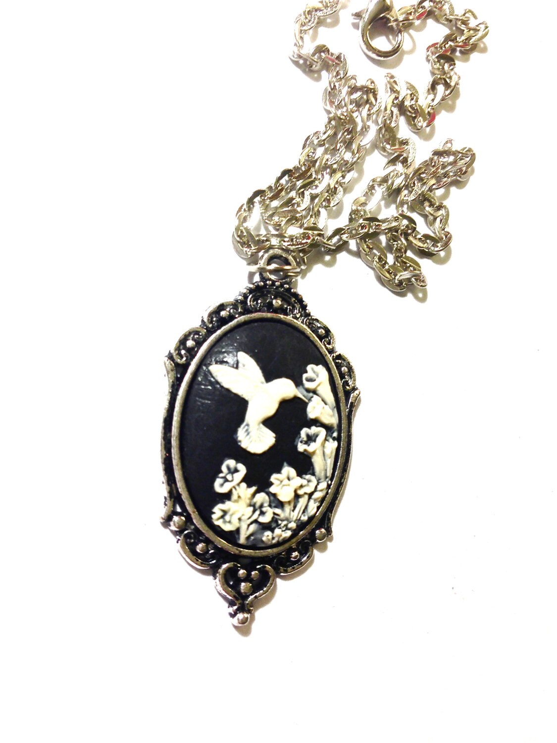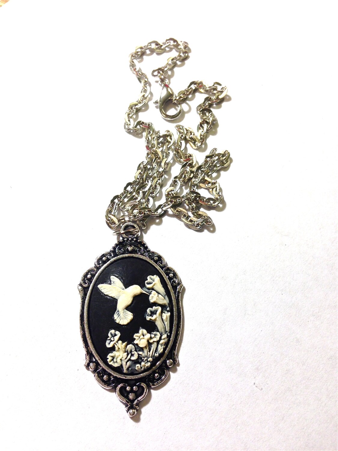 A Pure Sin original handmade item made by myself; this item is just for you! This is a unique, pronounced, and just brilliant piece of jewelry! She is an Ivory and black hummingbird that is fitted into a lovely cameo setting all hand done by myself 🙂 I put a lot of time and delicate care into each of these. This 3d antique cameo is a one of a kind and stunning.