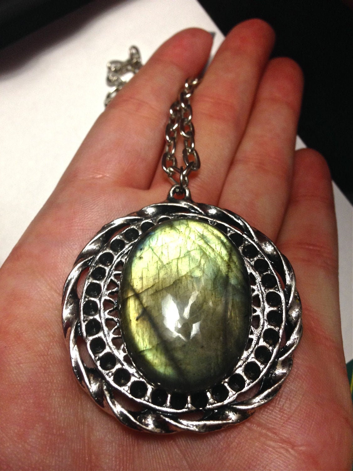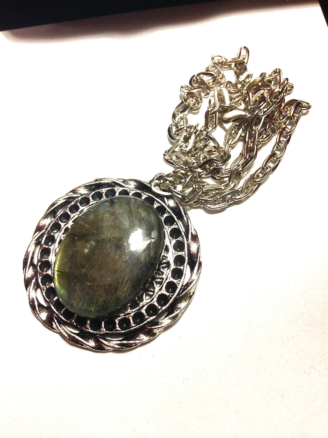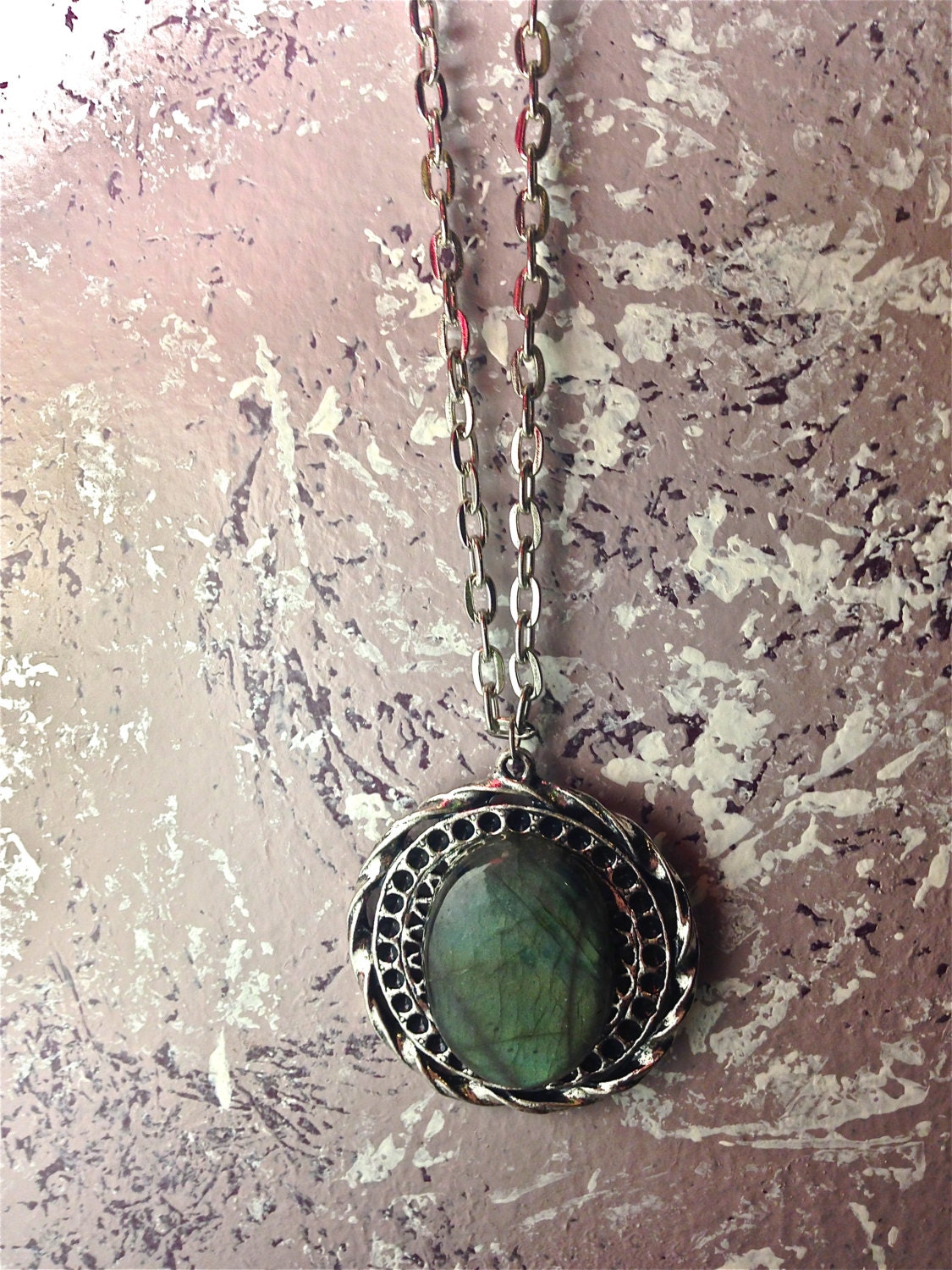 A Pure Sin original handmade item made by myself; this item is just for you! This lovely hand picked labradorite gemstone almost 30x40mm ( i hand pick each crystal and gemstone for the best quality(i go to a local rock shop in pa that is family owned for 50 years and has amazing stones) crystal this includes a necklace which has an antique silver toned setting that is a circle but this sets on top in the center. An antique toned silver necklace that measures 18 inches comes with. This color of this stone is incredibly riveting. One of my most cherished stones labradorite is linked to intuition, positive changes, and much more. Labradorite has dreamy and lush color that is very mesmerizing. One of the most beautiful colors ever. This is a one of a kind and just stunning!!!