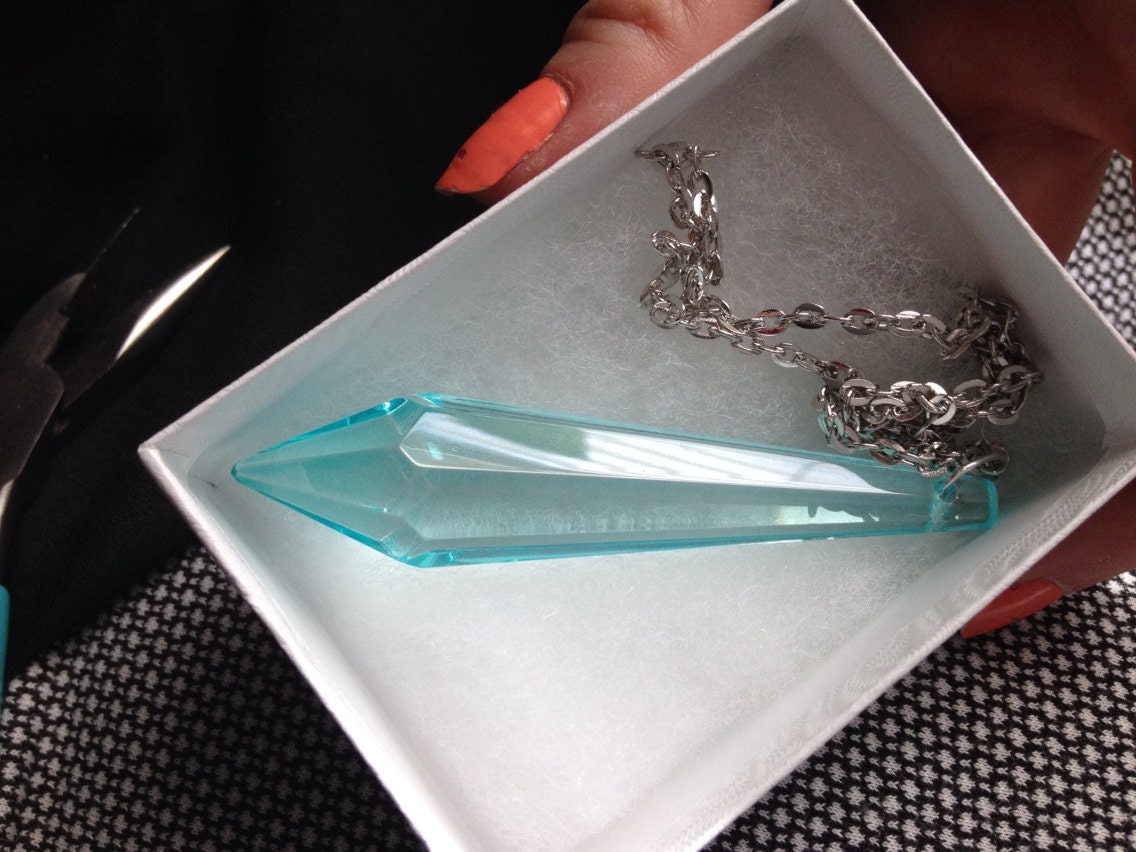 A gorgeous large teal glass chandelier prism which is 75mm and a real good quality cut of glass. This is hung from a beautiful 24 inch silver toned chain. This is a great simple necklace and is very fragile. It looks amazingly elegant and riveting. All of the angels and prism dementions make it glow and sparkle!