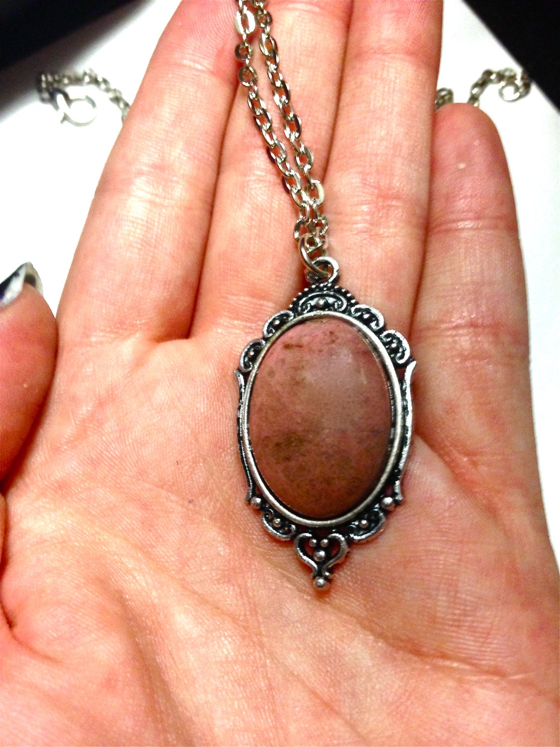This lovely hand picked gemstone ( i hand pick each crystal and gemstone for the best quality(i go to a local rock shop in pa that is family owned for 50 years and has amazing stones) necklace has an antique silver toned setting measuring to fit the 25x18mm stone. An antique toned silver necklace that measures 18 inches comes with. This color of this stone is incredibly riveting.