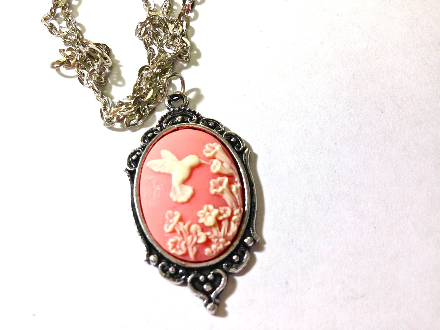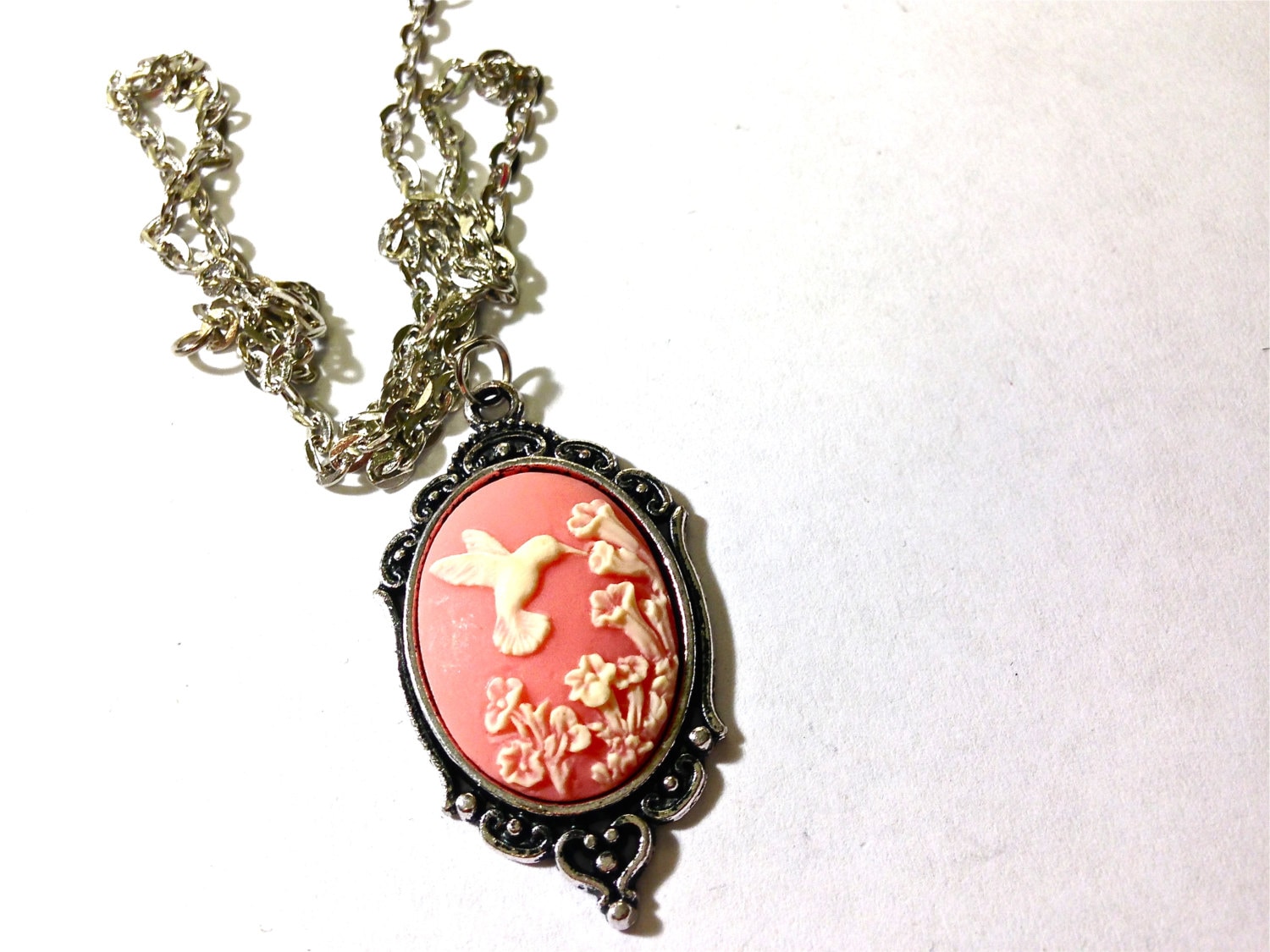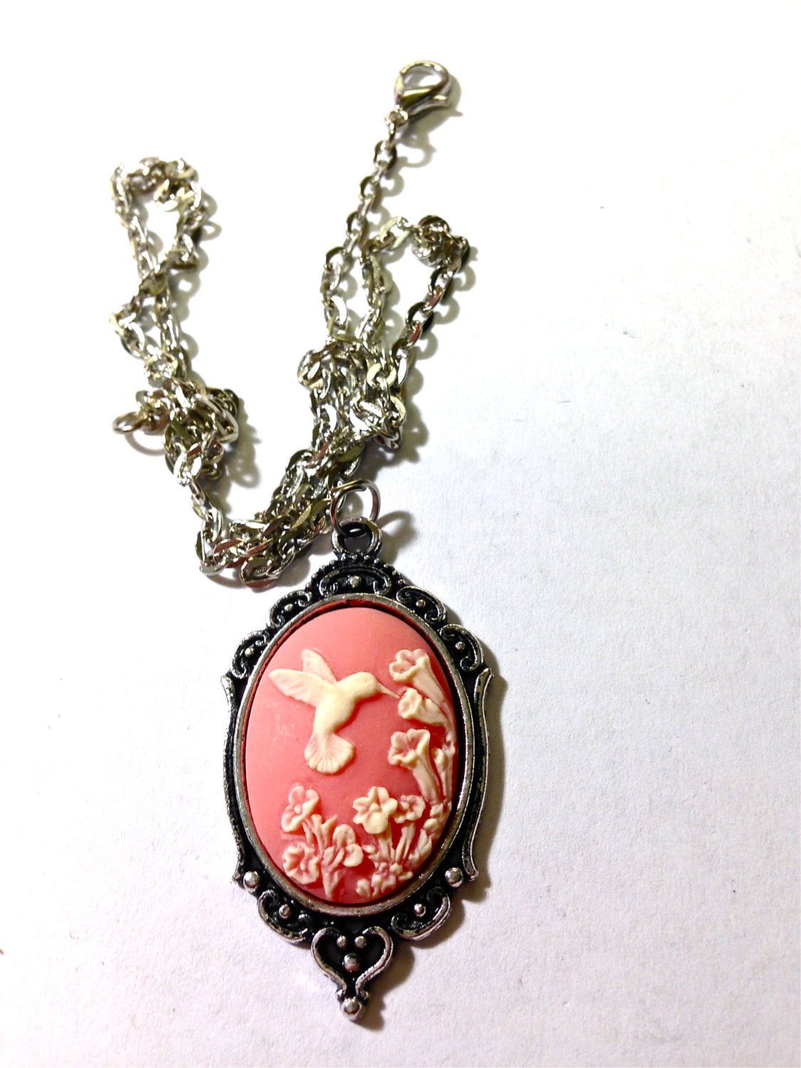 A Pure Sin original handmade item made by myself; this item is just for you! This is a unique, pronounced, and just brilliant piece of jewelry! She is an Ivory and pink hummingbird that is fitted into a lovely cameo setting all hand done by myself 🙂 I put a lot of time and delicate care into each of these. This 3d antique cameo is a one of a kind and stunning.