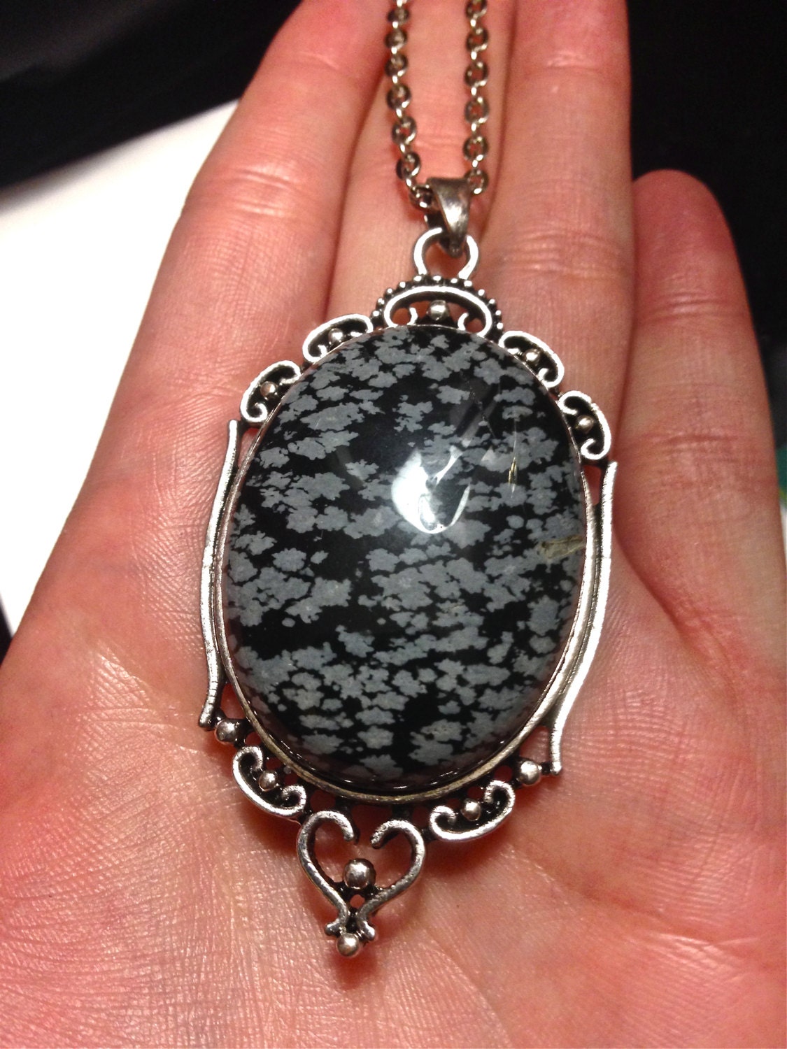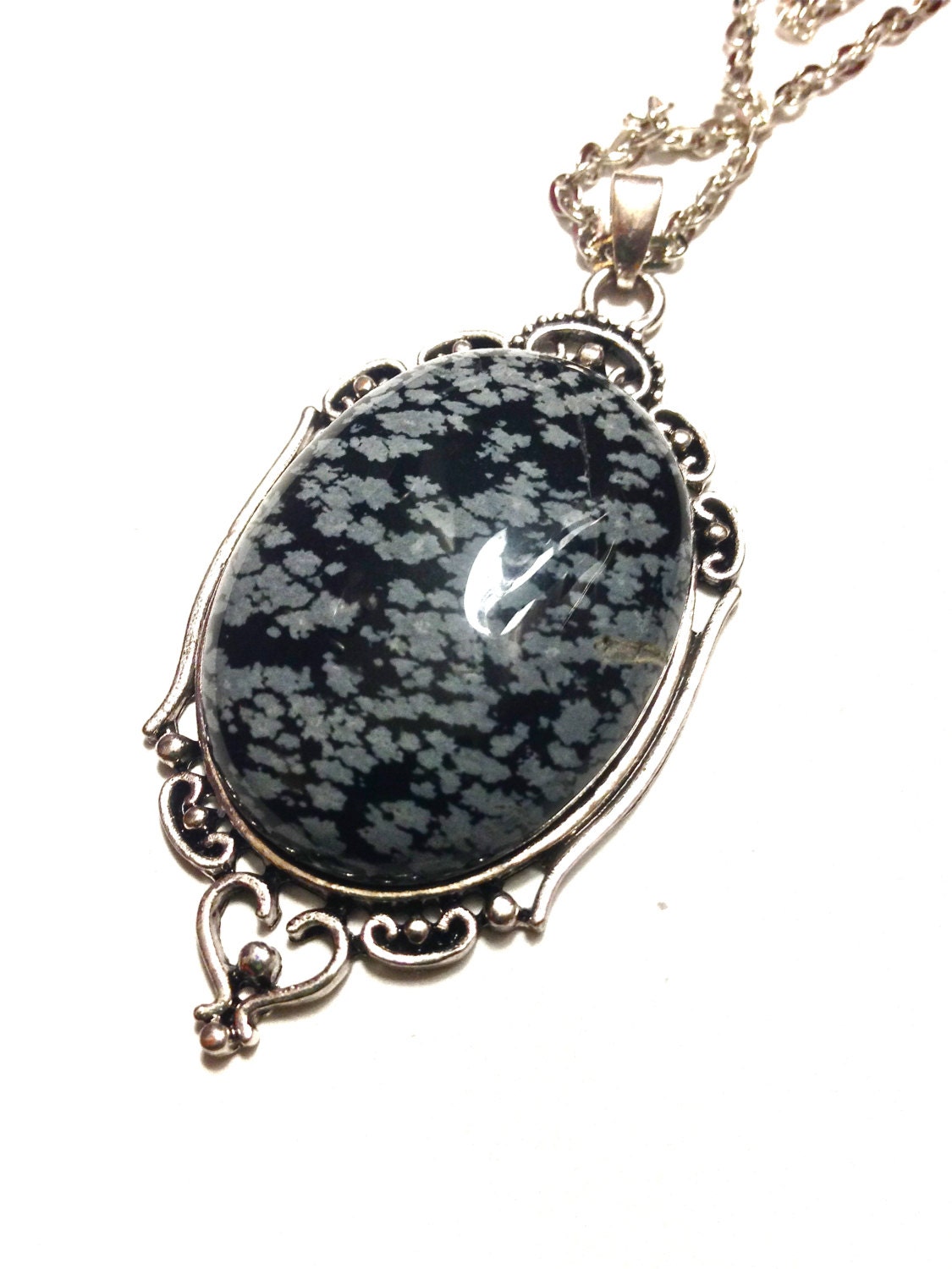 This lovely hand picked obsidian gemstone ( i hand pick each crystal and gemstone for the best quality(i go to a local rock shop in pa that is family owned for 50 years and has amazing stones) necklace has an antique silver toned setting measuring to fit the 25x18mm stone. An antique toned silver necklace that measures 18 inches comes with. This color of this stone is incredibly riveting.