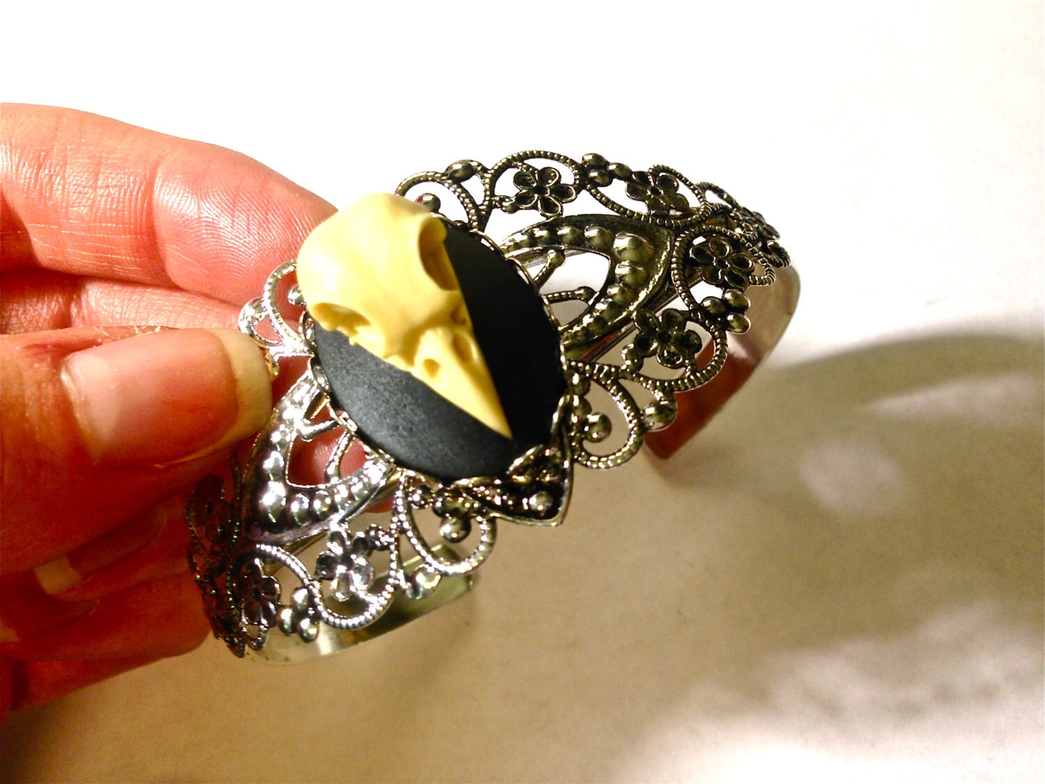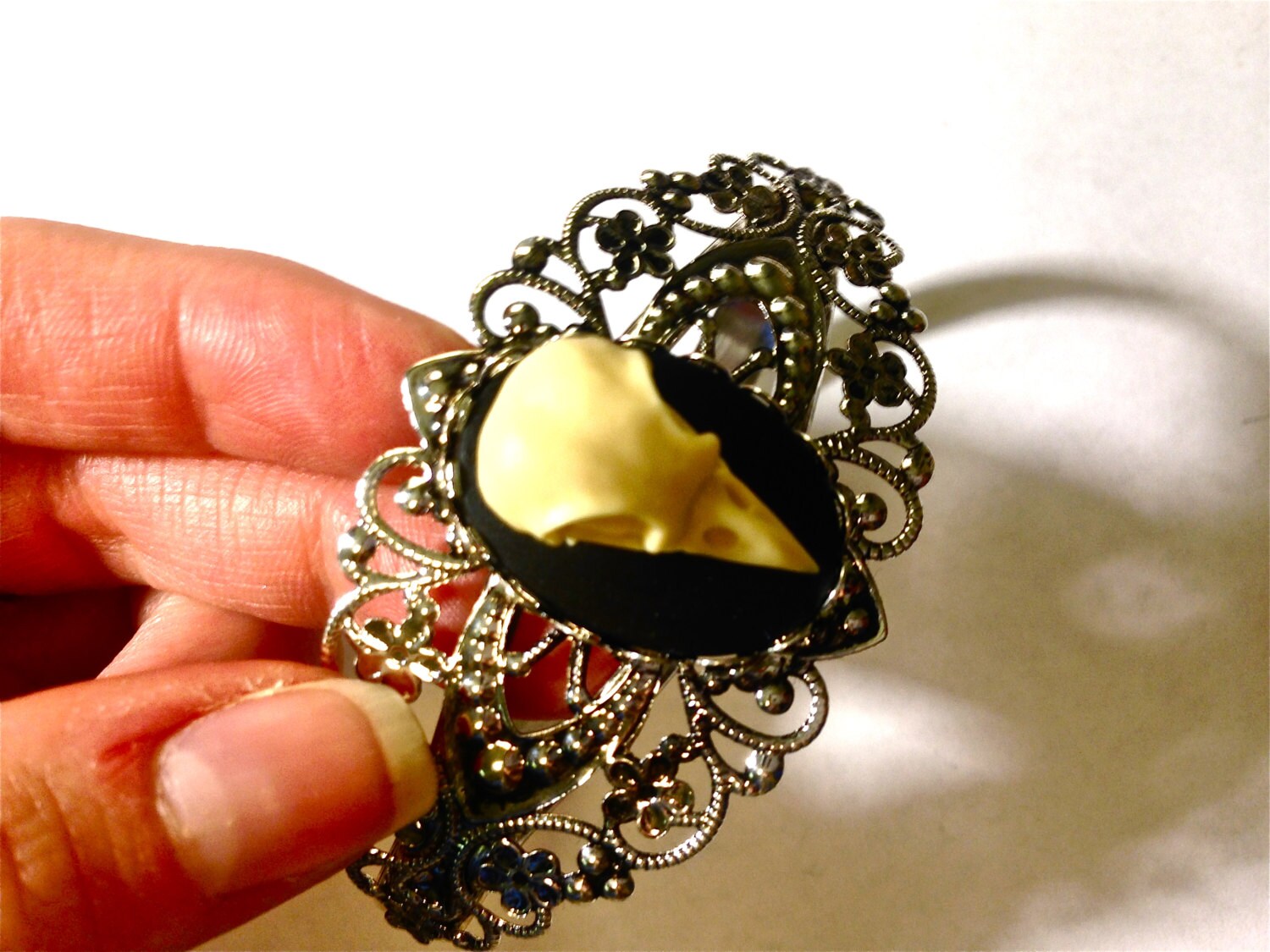 This lovely antiqued silver cuff bracelet has an amazing 25x 18mm cameo (1.5" tall), Raven 3d Skull resin casting cameo with impeccable detail set in the inside of the lovely setting. It is stylish and elegant for everyday, or to dress up for any occasion or a special one indeed! This raven is high quality and is cute and creepy. Simply magnificent and such a statement piece!